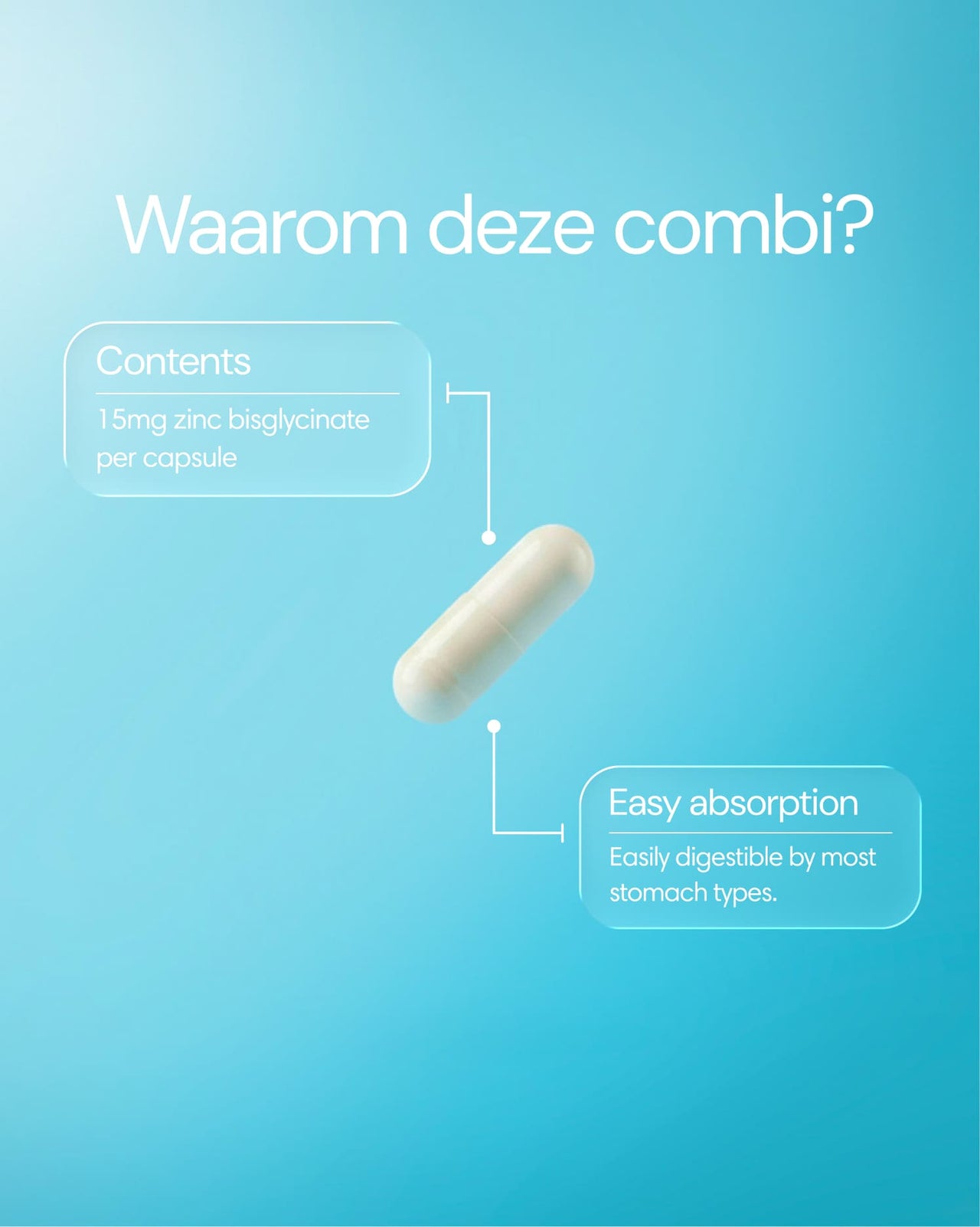 With 15 mg you stay below the maximum daily amount, even if you already get enough zinc from your diet. And although we use the most absorbable form, a zinc supplement is never absorbed 100 percent.
